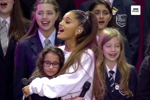 Ariana s-a alăturat trupei şi a cântat aumite versuri din melodie în timp ce Chris Martin i-a spus că este timpul ca oamenii din Manchester să „cânte pentru ea”. În timpul serii, Grande a cântat şi alături de trupa Black Eyed Peas melodia-hit ‘Where Is The Love?’, iar Miley Cyrus s-a alăturat pentru a interpreta o versiune a trupei Crowded House ‘Don’t Dream It’s Over’.