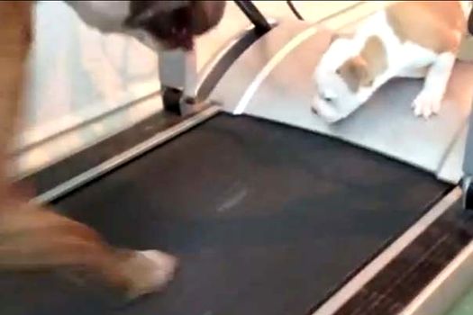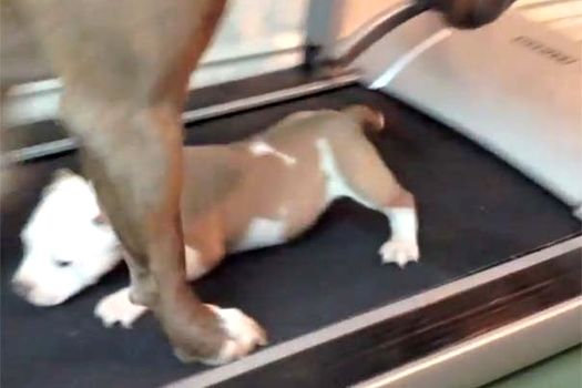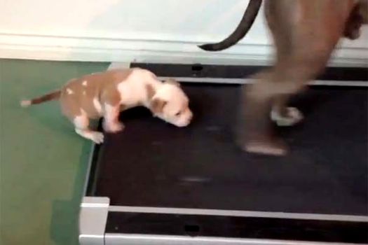 Micuţul Bandit priveşte anevoios cum unul dintre părinţii săi merge agale pe o bandă specială de antrenament. Stăpânul patrupedelor filmează scena şi reuşeşte să surprindă momentul în care micuţul căţel decide că este timpul să îşi urmeze părintele în activităţile de menţinere în formă.