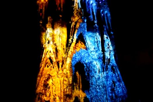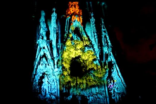 Astfel, cu ajutorul instalaţiilor de lumini, Sagrada Familia s-a transformat peste noapte într-o clădire scăldată în diferite nuanţe de culori.