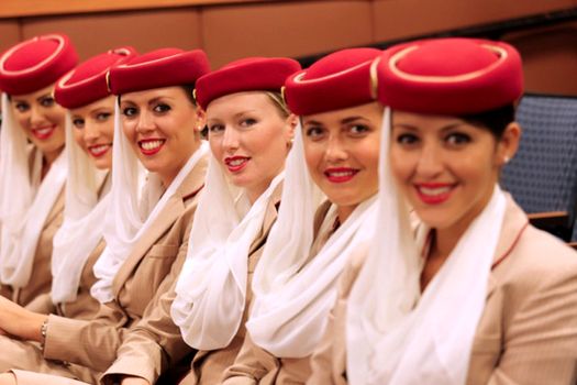 Aeronavele deosebite ale companiei oferă cocktail-baruri, scaune enorme, având singurul serviciu de duş cu spa din lume ce poate fi făcut în timpul zborului. Emirates se mândreşte, de asemenea, cu recordul pentru cei mai mulţi pasageri pe un zbor regulat, programat cu noua lor bijuterie- un avion cu reacţie A380, cu 615 locuri, cel mai nou flotei sale de lux. Iar echipajul de însoţitori de zbor se ridică la aceleaşi standarde. Clienţii ce îşi permit să zboare în asemenea condiţii sunt serviţi de însoţitori de zbor care sunt aleşi pe sprânceană recrutori globali Emirates. Aceştia intervievează circa 200.000 de candidaţi pe an din întreaga lume şi selectează un norocos din 5000 să lucreze pentru compania lor.