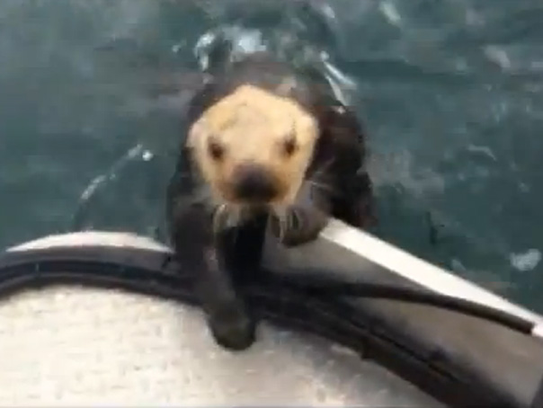 La un moment dat, autorul filmului postat pe Youtube surprinde o vidră care se urcă pe partea din spate a vasului său, încercând să scape de atacul balenelor care o urmăreau.