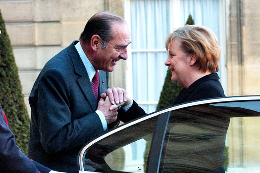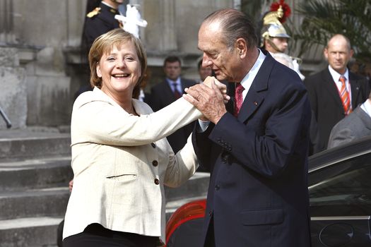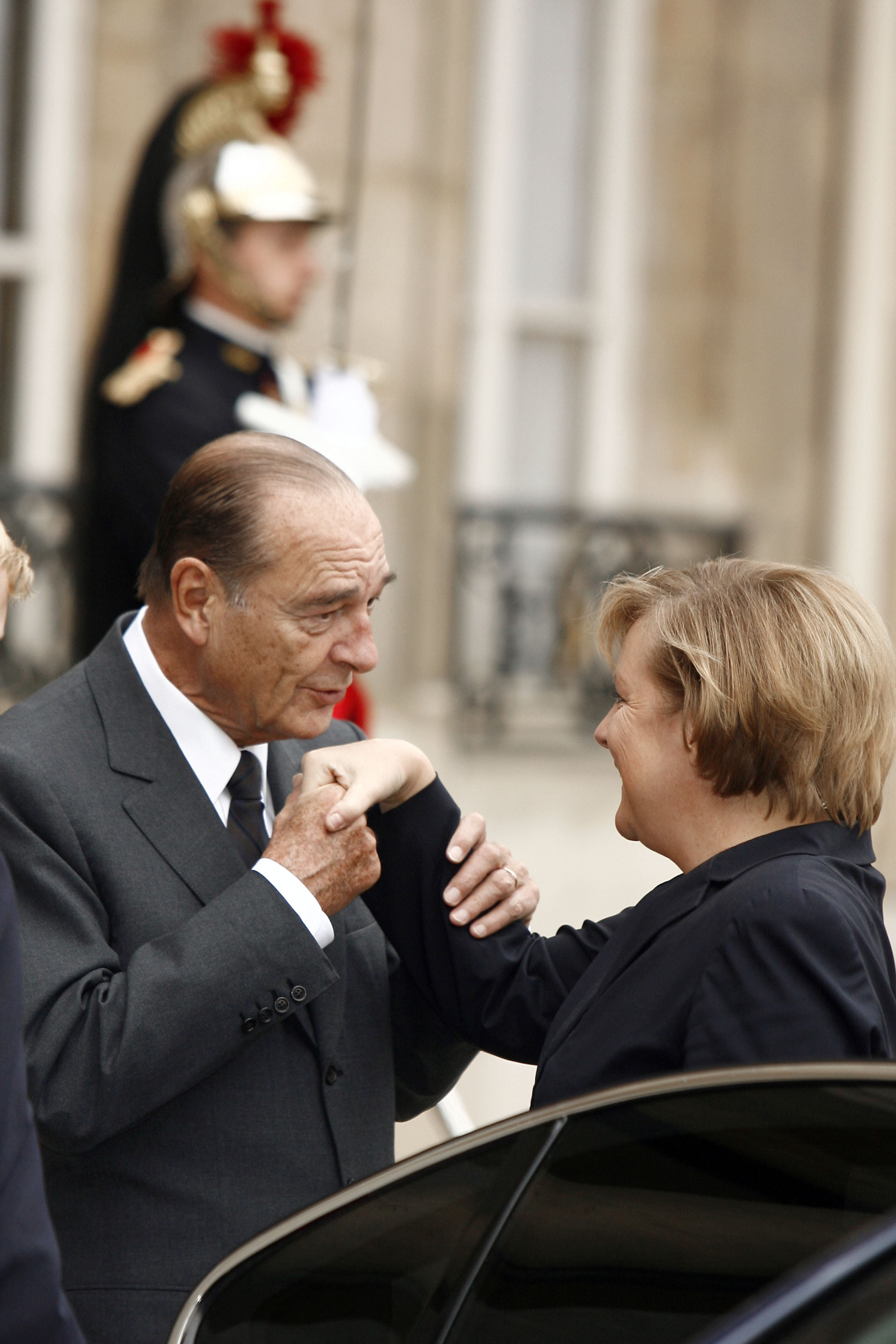 Preşedintele francez Jacques Chirac o primeşte pe Angela Merkel la Palatul Elysee, cu ocazia summit-ului formal dintre cele două ţări, pe 12 octombrie 2006