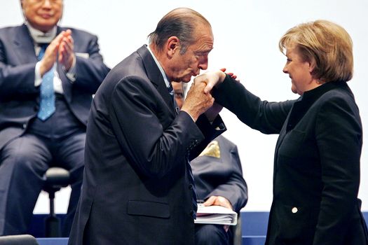 Preşedintele francez Jacques Chirac îi sărută mâna noului cancelar ales al Germaniei, când soseşte la Palatul Elysee, în Paris, Franţa, 23 noiembrie 2005. Parisul a fost prima ei deplasare oficială ca nou lider al Germaniei.