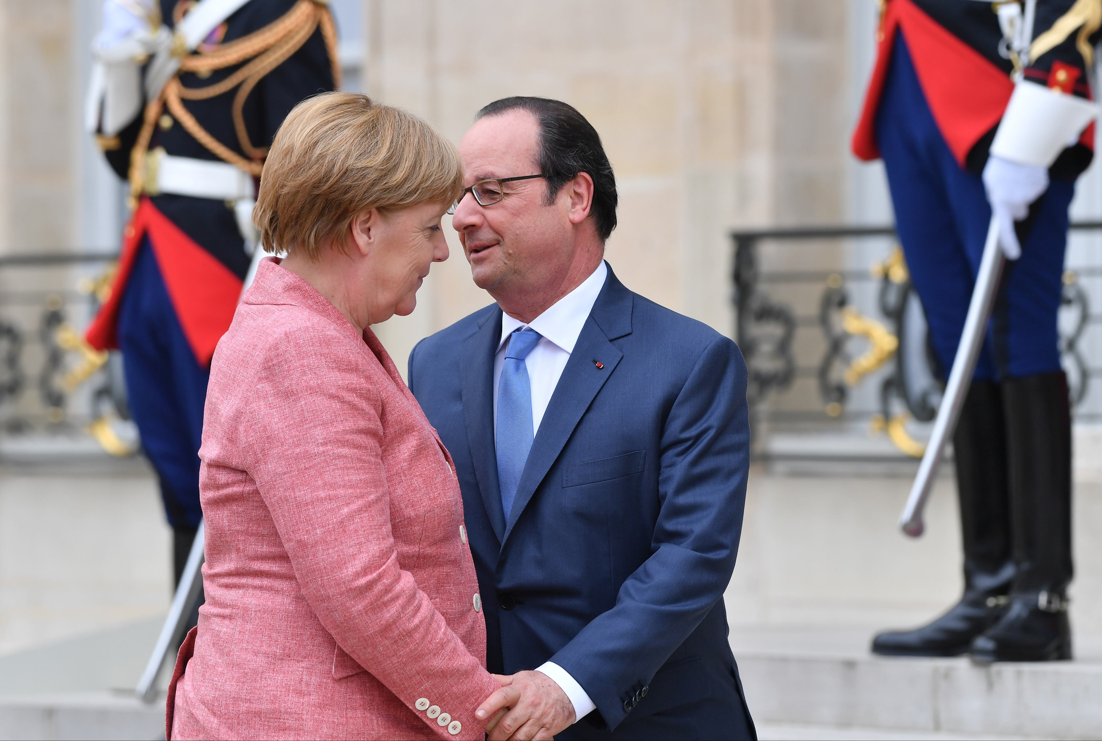 Preşedintele Francois Hollande o primeşte pe Angela Merkel, pe 4 iulie 2016, la Palatul Elysee, în Paris.