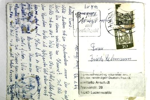 Apoi a fost şocată de aspectul vechi al imaginilor alb-negru cu Berlinului, Poarta Brandenburg, Biserica Memorială Kaiser Wilhelm şi alte repere. Cu toate acestea, numele de pe cartea poştală a uimit-o cu adevărat.