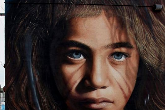 Ochii albaştri ai unui copil melancolic sunt puşi pe-un perete de clădire din New York. În muralul contemporan hiperrealist, fetiţa are chip angelic.