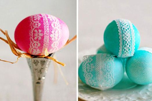 2. Ouă cu „model” de Dantelă: Pentru că pastelurile şi stilul romantic sunt în mare vogă în design, puteţi să realizate ouăle de Paşte cu model de dantelă imprimat în culoare. Cum procedaţi? Foarte simplu: legaţi dantelă strâns în jurul oului deja fiert şi scufundaţi-l în mixul de culoare dorit (culoare de ou amestecată în apă caldă + puţin oţet), scrie ilovehandmade.ro. Rezultatul va crea senzaţie la masă de Paşte.