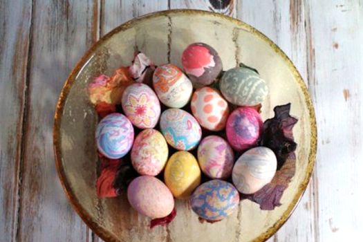1. Ouă vopsite prin transferul culorii şi modelului de pe materialele de Mătase: Dacă aveţi prin casă bucăţi de materiale de mătase, cu model şi culori interesante, atunci le puteţi folosi în decorarea ouălor fierte pentru Paşte. Tăiaţi materialul în pătrăţele suficient de mari cât să acopere un ou, legatile la un capăt şi imbrati tot aranjamentul într-un alt material (de preferinţă alb). Scufundaţi ouăle într-un vas cu 50% oţet şi 50% apă caldă şi fierbeţi timp de 45 de minute. Lăsaţi-le să se răcească şi scoteti-le din materialele în care le-aţi învelit. Un pic de luciu dat de ulei sau grăsime şi gata.