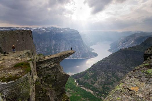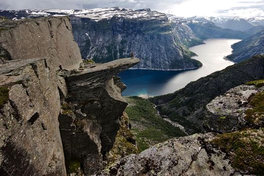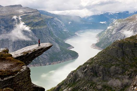 Trolltunga este o destinaţie căutată de amatorii de senzaţii tari, dornici să se fotografieze pe marginea prăpastiei, la 1.100 de metri altitudine, relatează Huffington Post. În ultima eră glaciară, o parte din munte a îngheţat, s-a rupt şi a lăsat o bucată de stâncă plutind ameninţător la 700 de metri deasupra lacului Ringedalsvatnet din Skjeggedal, în Norvegia.