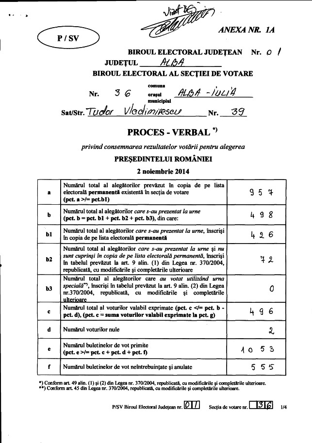 Astfel arată, de exemplu, pagina a doua din procesul verbal al secţiei de votare nr. 36 din Alba-Iulia, strada Tudor Vladimirescu nr. 39: