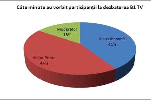 La precedenta dezbatere electorală, desfăşurată marţi seară, la Realitatea TV, Victor Ponta a vorbit în total 41 de minute, iar Klaus Iohannis 37 de minute. Marţi, emisiunea, preluată simultan şi de Antena 3, România TV, B1 şi Digi24, a fost urmărită de 3,5 milioane de persoane, conform paginademedia.ro.