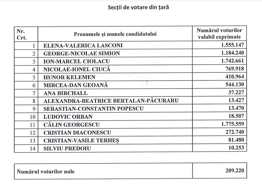 ACTUALIZARE: În procesele verbale trimise de BEC se arată că au fost numărate toate voturile din ţară şi doar o parte din străinătate – 161 de secţii– care îl plasează până acum – pe Marcel Ciolacu pe locul 2 în cursa pentru Cotroceni . Asta înseamnă că 600.000 de voturi din străinătate – o parte din cele care au plasat-o pe Elena Lasconi în turul 2 al prezidenţialelor – nu au fost încă numărate. Cei 9 judecători ai CCR urmează să hotărască astăzi dacă pot lua o decizie definitivă privind anularea scrutinului, în baza unei numărători incomplete.