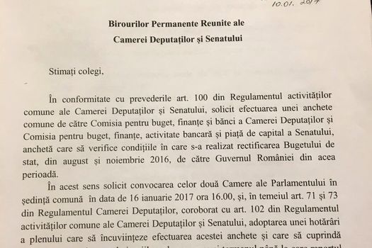 „Este o solicitare din partea preşedintelui Camerei Deputaţilor, Liviu Dragnea, privind efectuarea unei anchete comune ale comisiilor de buget ale Camerei Deputaţilor şi Senatului prin care să fie verificate condiţiile în care s-a realizat rectificarea bugetului de stat şi a bugetului asigurărilor de stat din august şi noiembrie 2016 de către Guvernul României din acea perioadă”, a declarat deputatul PSD Marcel Ciolacu, secretar al Camerei, la finalul şedinţei Birourilor Permanente Reunite.