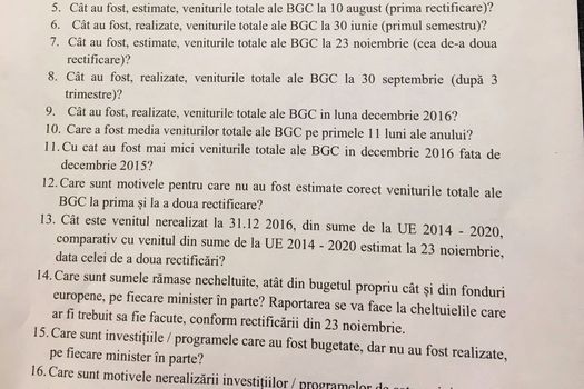 Comisiile comune ar urma să afle răspunsuri la întrebări precum: „Care este modul în care s-au constituit veniturile potenţiale pentru a se putea efectua o rectificare pozitivă? Care sunt motivele pentru care nu au fost estimate corect veniturile totale ale bugetului general consilidat la prima şi a doua rectificare? Care sunt investiţiile/programele care au fost bugetate, dar nu au fost realizate pe fiecare minister în parte?”, potrivit solicitării depuse la Birourile Permanente Reunite.