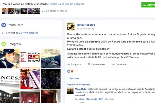 „Practic, România nu este de acord ca, atunci când furi, să fii graţiat şi să poţi returna banii. România vrea să plătească 2.000 de RON pe lună pentru acela care a furat 20.000 de RON. Da’ tare deştepţi sunteţi sclipitorilor! Şi poate îmi spuneţi şi mie care este munca voastră şi cu ce cotizaţi voi la stat, ăştia care va duceţi de la 09 dimineaţa la proteste? Putorilor!”, a scris Sabrina Maria Nedelcu pe pagina ei de Facebook.