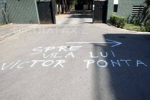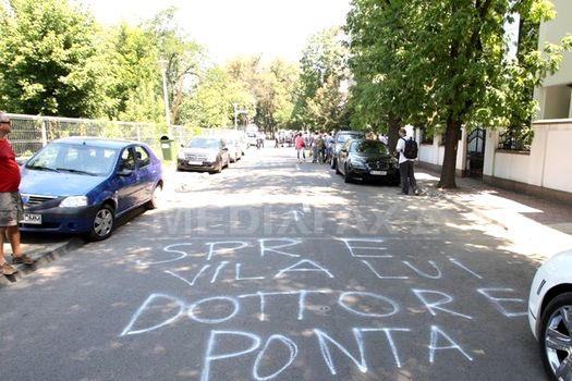 Pe strada care duce la Vila Dante, pe care a fost oprită circulaţia auto, sunt inscripţii cu creta pe asfalt, la fiecare câţiva metri, cu textul „Spre vila lui Victor Ponta!” sau „Spre vila lui Dottore Ponta”.