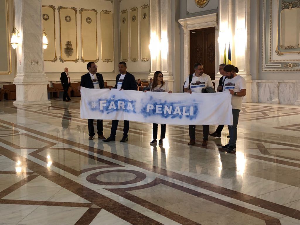 Parlamentarii partidelor de opoziţie au încercat să boicoteze, marţi, plenul în care a fost dezbătut şi votat proiectului care aduce modificări Codului penal. Aceştia au părăsit timp de câteva minute sala, în speranţa că nu va fi întrunit cvorumul necesar pentru votul asupra iniţiativei legislative. Aleşii USR au afişat bannere cu mesajul „Fără penali”.