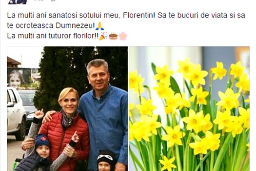 ” La mulţi ani sănătoşi soţului meu, Florentin! Să te bucuri de viaţă şli să te ocrotească Dumnezeu! La mulţi ani tuturor florilor”, a scris Firea în mesajul său, alături de două fotografii, una în care apare alături de soţul ei, Florentin Pandele şi de doi dintre copiii lor, iar alta cu narcise.