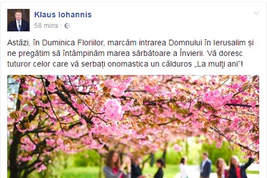 ”Astăzi, în Duminica Floriilor, marcăm intrarea Domnului în Ierusalim şi ne pregătim să întâmpinăm marea sărbătoare a Învierii. Vă doresc tuturor celor care vă serbaţi onomastica un călduros