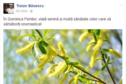 Fostul preşedinte al României, Traian Băsescu, a postat pe contul său de Facebook o fotografie cu o ramură de salcie, alături de care a scris: ”În Duminica Floriilor, viaţă senină şi multă sănătate celor care vă sărbătoriţi onomastica”.