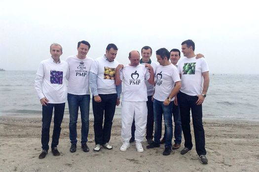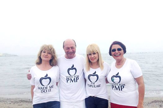 În unele dintre fotografii, preşedintele dă mâna cu candidaţi şi lideri ai PMP, între care Elena Udrea, care are şi ea un tricou alb cu sigla PMP şi inscripţia „I’m popular”, şi Cristian Preda, îmbrăcat într-un tricou pe care este imprimată o poză cu mere roşii.