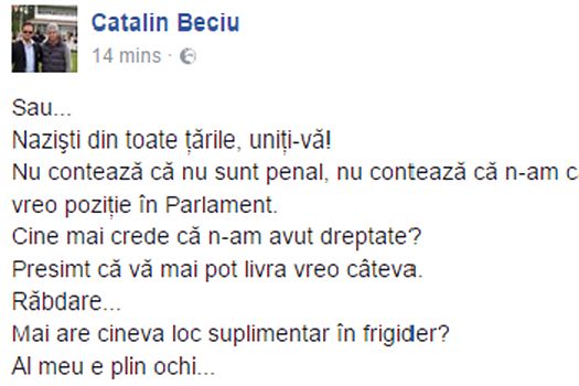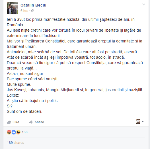 Doar că vreau să fiu sigur că pot să respect Constituţia, care vă garantează dreptul la viaţă…Astăzi, nu sunt sigur. Fac spume când văd nazişti. Multe spume. Jos Koveşi, Iohannis, Mungiu Micţiunedi si, în general, jos cretinii şi naziştii! Editez: A, ştiu că limbajul nu-i politic. Şi? Sunt om de afaceri”, a scris Cătălin Beciu pe Facebook.