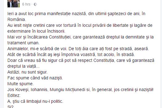 ”Ieri a avut loc prima manifestaţie nazistă, din ultimii şaptezeci de ani, în România. Au iesit nişte cretini care vor tortură în locul privării de libertate şi lagăre de exterminare în locul închisorii. Mai vor şi încălcarea Constituţiei, care garantează dreptul la demnitate şi la tratament uman. Animalelor, mi-e scârbă de voi. De toţi ăia care aţi fost pe stradă, aseară. Atât de scârbă încât aş ieşi împotriva voastră, tot acolo, în stradă.