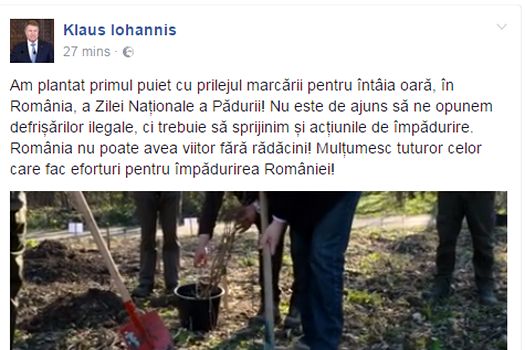 „Am plantat primul puiet cu prilejul marcării pentru întâia oară, în România, a Zilei Naţionale a Pădurii!”, a declarat preşedintele Klaus Iohannis, într-o postare pe Facebook, însoţită de un material video care îl înfăţişa pe şeful statului plantând puietul.