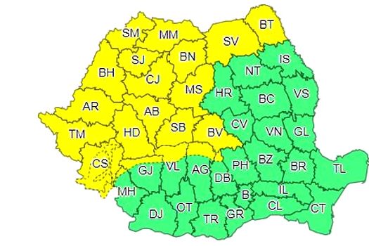 Potrivit Administraţiei Naţionale de Meteorologie (ANM), avertizarea cod galben intră în vigoare duminică, la ora 12.00 şi este valabilă până la ora 18.00.
