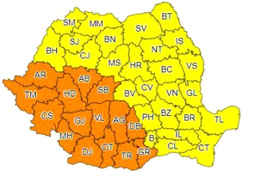 De la ora 18.00 în judeţele Arad, Timiş, Caraş-Severin, Hunedoara, Alba, Sibiu, Mehedinţi, Gorj, Dolj, Olt, Vâlcea, Argeş, Dâmboviţa, Teleorman şi Giurgiu vor fi perioade, la început în sud-vest, apoi şi în sud, cu intensificări puternice ale vântului (rafale de peste 80 – 90 km/h), vijelii, frecvente descărcări electrice, averse torenţiale şi grindină.