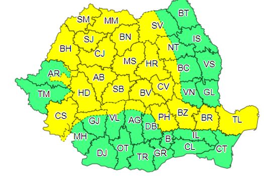 Codul galben vizează judeţele Satu Mare, Maramureş, Sălaj, Suceava, Bistriţa-Năsăud, Neamţ, Harghita, Mureş, Braşov, Covasna, Prahova, Dâmboviţa, Argeş, Vâlcea, Mehedinţi, Gorj, Sibiu, Alba, Cluj, Bihor, Arad, Timiş, Caraş Severin, Hunedoara, Bacău, Vrancea, Buzău, Brăila şi Tulcea.