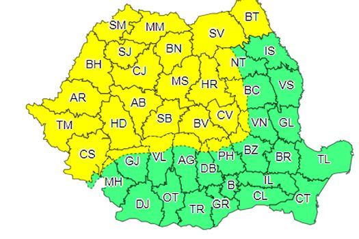 ANM a emis şi un cod galben de vânt puternic, valabil mâine, între orele 2 şi 10.00. Zonele afectate: Banat, Crişana, Maramureş, Transilvania, nordul Moldovei şi zona montană. În regiunile vizate, vântul se va intensifica temporar, cu viteze de 55…65 km/h, iar pentru intervale scurte de timp vor fi rafale de peste 65…70 km/h. În zona montană vor fi intensificări susţinute ale vântului, cu rafale care pe creste vor depăşi 100…120 km/h.