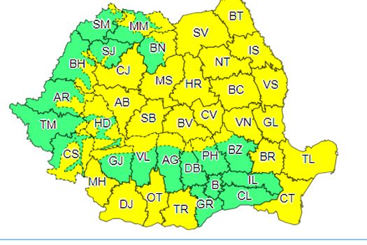 Totodată, a fost emis un cod galben de vânt puternic, pentru mâine între orele 10 – 23. Zonele afectate : Oltenia, Moldova, Dobrogea, local Muntenia şi Transilvania, precum şi zona montană