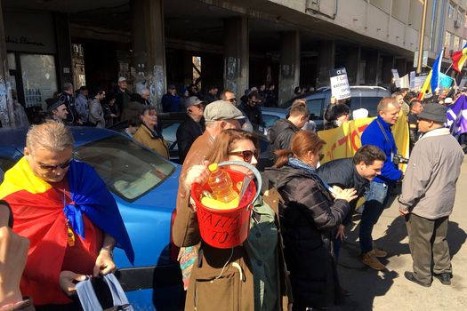 Manifestanţii au venit cu eugenii, găleţi cu pomeni electorale şi scandează „Dacă alegeţi mafia, pierde România”, „Nu vrem să fim conduşi de hoţi” şi „DNA să vin să vă ia”.