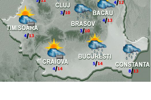 Va ploua în Maramureş şi local în Transilvania, iar în celelalte zone ploi sau burniţă vor fi pe arii restrânse, mai ales în prima parte a zilei. În nordul Carpaţilor Orientali, iar ziua şi la altitudini mari în Carpaţii Meridionali precipitaţiile vor fi sub formă de lapoviţă şi ninsoare. Vântul va sufla slab şi moderat, cu intensificări în zona montană înaltă din nordul ţării. Temperaturile maxime se vor încadra între 9 şi 16 grade, iar cele minime între 1 şi 9 grade. Local şi temporar se va semnala ceaţă.