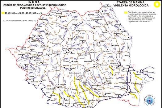 Potrivit Institutului Naţional de Hidrologie şi Gospodărire a Apelor, având în vedere situaţia hidrometeorologică actuală şi prognoza meteorologică pentru următoarele 72 de ore, ca urmare a cedării apei din stratul de zăpadă, precipitaţiilor lichide prognozate şi propagării, se pot produce scurgeri importante pe versanţi, torenţi, pâraie, viituri rapide pe râurile mici cu posibile efecte de inundaţii locale, creşteri de debite şi niveluri cu posibile depăşiri ale cotelor de atenţie.
