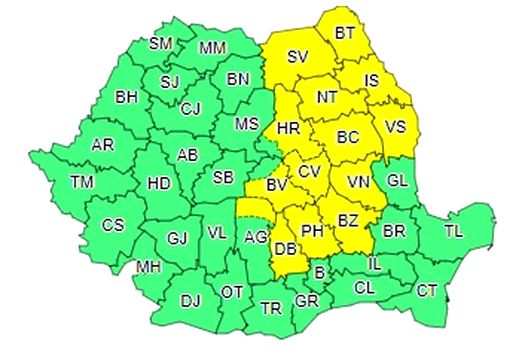 A doua atenţionare cod galben de ninsori intră în vigoare pe 14 februarie, la ora 11.00 şi expiră pe 15 februarie, la ora 11.00, vizând judeţele Suceava, Botoşani, Iaşi, Neamţ, Harghita, Bacău, Vaslui, Braşov, Covasna, Vrancea, Argeş, Dâmboviţa, Prahova şi Buzău.