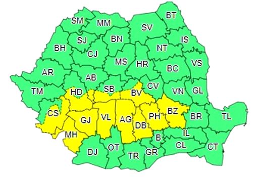 Prima atenţionare cod galben de ninsori abundente, local viscolite, depunere de strat consistent de zăpadă intră în vigoare marţi seară, la ora 22.00 şi expiră pe 14 februarie, la ora 11.00 şi vizează judeţele Caraş Severin, Mehedinţi, Gorj, Hunedoara, Alba, Sibiu, Braşov, Vâlcea, Argeş, Dâmboviţa, Prahova şi Buzău.