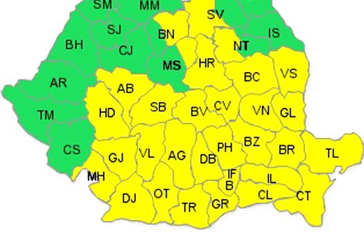 Atenţionarea este valabilă pentru Bucureşti şi judeţele Ilfov, Giurgiu, Mehedinţi, Dolj, Gorj, Olt, Teleorman, Argeş, Vâlcea, Dâmboviţa, Prahova, Călăraşi, Ialomiţa, Constanţa, Tulcea, Brăila, Buzău, Galaţi, Vrancea, Vaslui, Bacău, Neamţ, Suceava, Bistriţa-Năsăud, Mureş, Harghita, Covasna, Braşov, Sibiu, Alba şi Hunedoara.