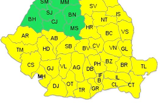 Atenţionarea este valabilă de duminică, de la ora 20.00 până luni la ora 23.00, în Capitală şi judeţele Ilfov, Giurgiu, Mehedinţi, Dolj, Gorj, Olt, Teleorman, Argeş, Vâlcea, Dâmboviţa, Prahova, Călăraşi, Ialomiţa, Constanţa, Tulcea, Brăila, Buzău, Galaţi, Vrancea, Vaslui, Bacău, Neamţ, Suceava, Bistriţa-Năsăud, Mureş, Harghita, Covasna, Braşov, Sibiu, Alba, Hunedoara, Arad, Timiş şi Caraş-Severin.