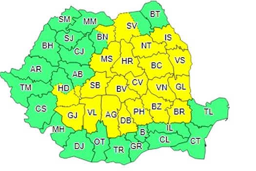 Prima atenţionare a meteorologilor a intrat în vigoare luni la ora 13.00 şi va expira la ora 20, fiind afectate regiunile vestice, nordice, centrale şi nord-estice şi zonele de munte. Astfel, luni, îndeosebi în zonele deluroase şi montane, precum şi în Transilvania, Moldova şi Maramureş, temporar instabilitatea atmosferică va fi accentuată şi se va manifesta prin vijelii, averse torenţiale, frecvente descărcări electrice şi grindină. Cantităţile de apă vor depăşi local 20 l/mp şi izolat 40…50 l/mp. Astfel de fenomene vor fi în cursul serii şi în regiunile sudice, dar pe arii mai restrânse.