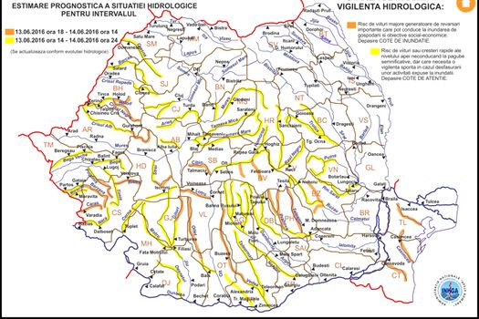 Potrivit INHGA, „fenomenele se pot produce cu intensitate şi probabilitate mai mare în intervalul 13.06.2016 ora 21:00 – 14.06.2016 ora 09:00 în unele bazine hidrografice din zona de munte aferente judeţelor: Caraş-Severin, Gorj, Vâlcea, Hunedoara şi Sibiu”.
