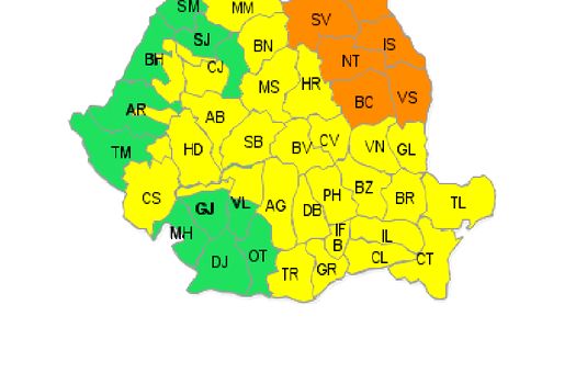 A doua avertizare cod galben intră în vigoare marţi la ora 23.00 şi este valabilă până miercuri la ora 11.00, vizând 18 judeţe.