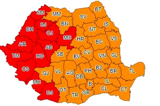 În aceeaşi perioadă, este în vigoare şi un cod portocaliu de caniculă. În Moldova, Dobrogea, Muntenia şi local în Maramureş, Transilvania şi Oltenia temperaturile maxime se vor situa, în general, între 36 şi 39 de grade, valori cu mult mai ridicate decât mediile climatologice specifice perioadei.