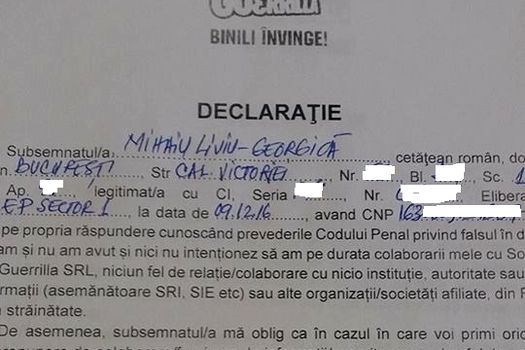 Acum fenomenul apartenenţei la serviciile secrete s-a instalat în mai toata presa, inclusiv la primul meu loc de muncă. O excepţie este şi Radio Guerrilla, un radio care a avut de suferit şi a fost inchis doi ani din cauza, ca să vezi, tot a unor acoperiţi, un radio care nu are mogul sau acoperiţi, unde toţi cei care făptuiesc un act jurnalistic au semnat o hârtie prin care îşi declară notarial neapartenenţa la serviciile secrete sub incidenţa a 100.000 de euro despăgubiri.