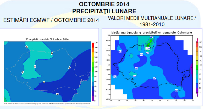 Cantităţile lunare de precipitaţii vor prezenta o tendinţă de excedent în majoritatea regiunilor, exceptând sud-estul, sudul şi vestul ţării unde local acestea vor fi apropiate de mediile climatologice.