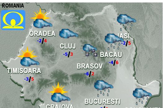 Temperaturile maxime se vor situa între 1 şi 9 grade, iar cele minime vor fi cuprinse între -10…-8 grade în estul Transilvaniei şi 3…4 grade pe litoral. În vestul şi sud-vestul ţării cerul va fi variabil, dar cu înnorări noaptea, când izolat vor fi condiţii de precipitaţii slabe mixte şi polei.