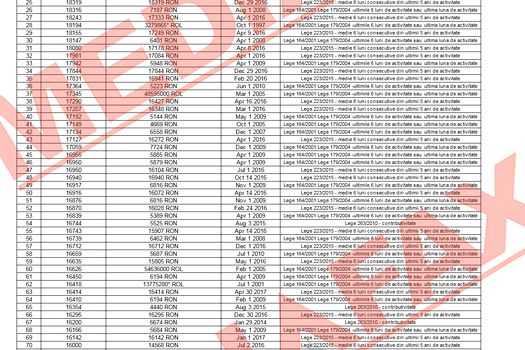 Cea mai mare diferenţă e reprezentată de o pensie, calculată în anul 2005 la o valoare lunară de 3.366 lei, şi recalculată ulterior conform legilor 164/2001 şi 179/2004, la care s-au aplicat indexările ce stabilesc majorarea cu 50% din creşterea salariului pe funcţie si un procent de 100% din rata anuală a inflaţiei, a ajuns în prezent la valoarea de 15.511 lei lunar.
