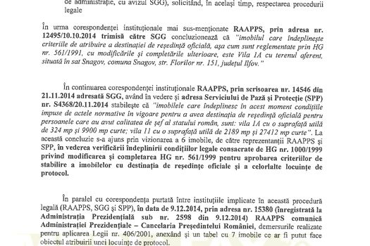 Ca urmare a acestei cereri, la 10 octombrie, RA-APPS a trimis SGG o adresă în care concluzionează că imobilul care îndeplineşte criteriile de atribuire a destinaţiei de reşedinţă oficială este Vila 1 A, cu terenul aferent, din Snagov. La 21 noiembrie, RA-APPS, pe baza şi a unei comunicări cu Serviciul de Protecţie şi Pază (SPP), stabileşte că imobilele care îndeplinesc în acest moment condiţiile pentru impuse de actele normative în vigoare pentru a avea destinaţia de reşedinţă oficială pentru persoanele care au avut calitatea de şef al statului sunt Vila 1A, cu o suprafaţă utilă de 324 metri pătraţi şi 9.900 metri ptraţi curte şi Vila 11, cu o suprafaţă utilă de 2.189 metri pătraţi şi 27.412 metri pătraţi curte.