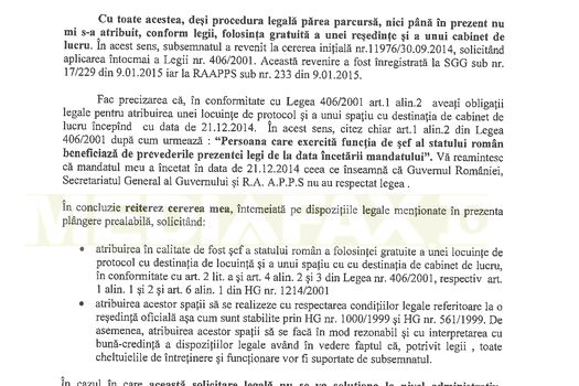 „Cu toate acestea, deşi procedura legal părea parcursă, nici până în prezent nu mi s-a atribuit, conform legii, folosinţa gratuită a unei reşedinţă şi a unui cabinet de lucru. În acest sens, subsemnatul a revenit la cererea iniţial din 30 septembrie, solicitând aplicarea întocmai a Legii 406/2001. Această revenire a fost înregistrată la SGG şi RA-APPS la 9 ianuarie. Fac precizarea că, în conformitate cu Legea 406/2001, aveaţi obligaţii legale pentru atribuirea unei locuinţe de protocol şi a unui spaţiu de lucru începând cu 21 decembrie”, scrie Băsescu în plângerea către Guvern, arătând că Guvernul, SGG şi RA-APPS nu au respectat legea.